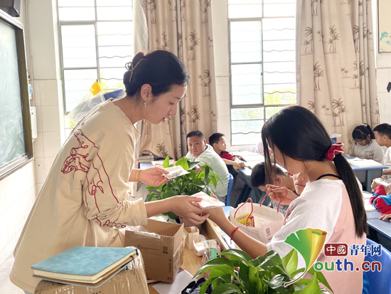 图为研支团成员鲁晨辉为学生发放小礼物。王谡阳 供图