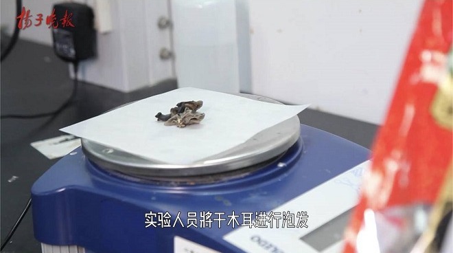 “青芽食育”团队的实验人员,在超市购买了黑木耳,将干木耳分等量的四份,室温下分别在实验器皿中浸泡2小时、4小时、8小时、16小时。实验人员取适量泡发液,用专门检测米酵菌酸的试剂盒进行测定,在2小时、4小时、8小时的泡发液中并未检出米酵菌酸。