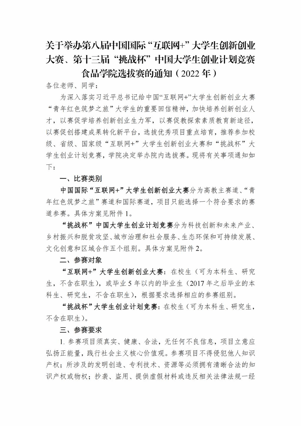 关于举办第八届中国国际“互联网+”大学生创新创业大赛、第十三届“挑战杯”中国大学生创业计划竞赛小黄书 选拔赛的通知(2022 年)